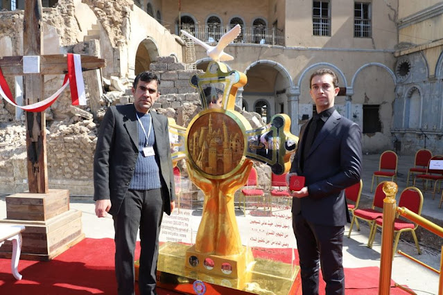 During the Mosul ceremony, the sculptor Omar Qais personally presented the Pope with a medallion displaying the city's demolished monuments—including the iconic al-Hadba' minaret and clock tower of the Al-Sa’a Dominican Church—set in a golden cross capped with a white dove and supported by two hands cradling the city. In return, the sculptor received a bronze medal engraved with the image of the Prophet Abraham and a map of Iraq.